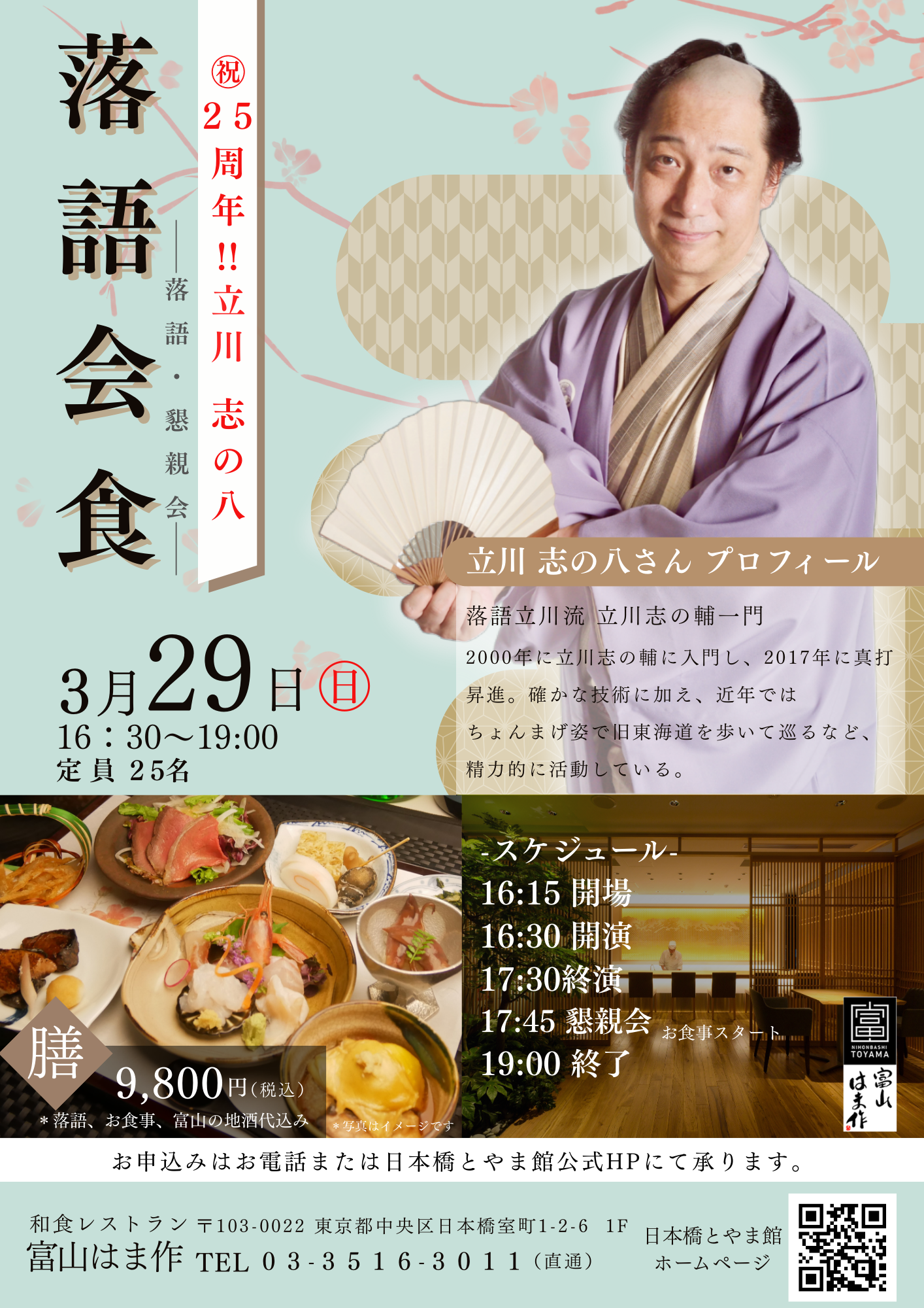 2026年3月29日に東京、日本橋とやま館内にあります、和食レストラン「富山はま作」にて、「立川志の八落語会食」を開催いたします。